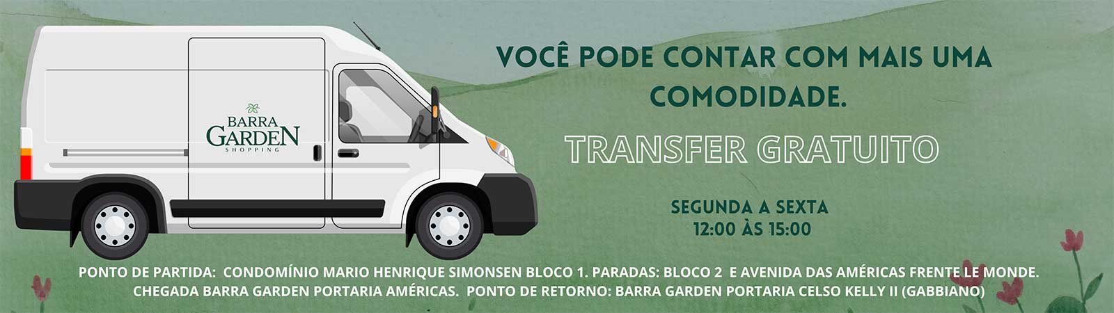 O Transfer é um serviço de transporte através de uma van para os clientes que estão no centro empresarial Mario Henrique Simonsen e Le Monde que querem vir para o Barra Garden Shopping.